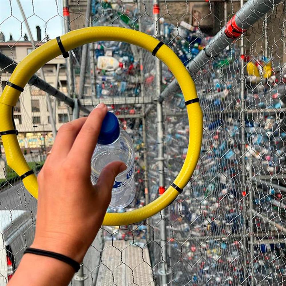 Se trata de un montaje realizado sobre un andamio modular rodeado por una malla metálica donde los ciudadanos podrán depositar botellas de plástico.